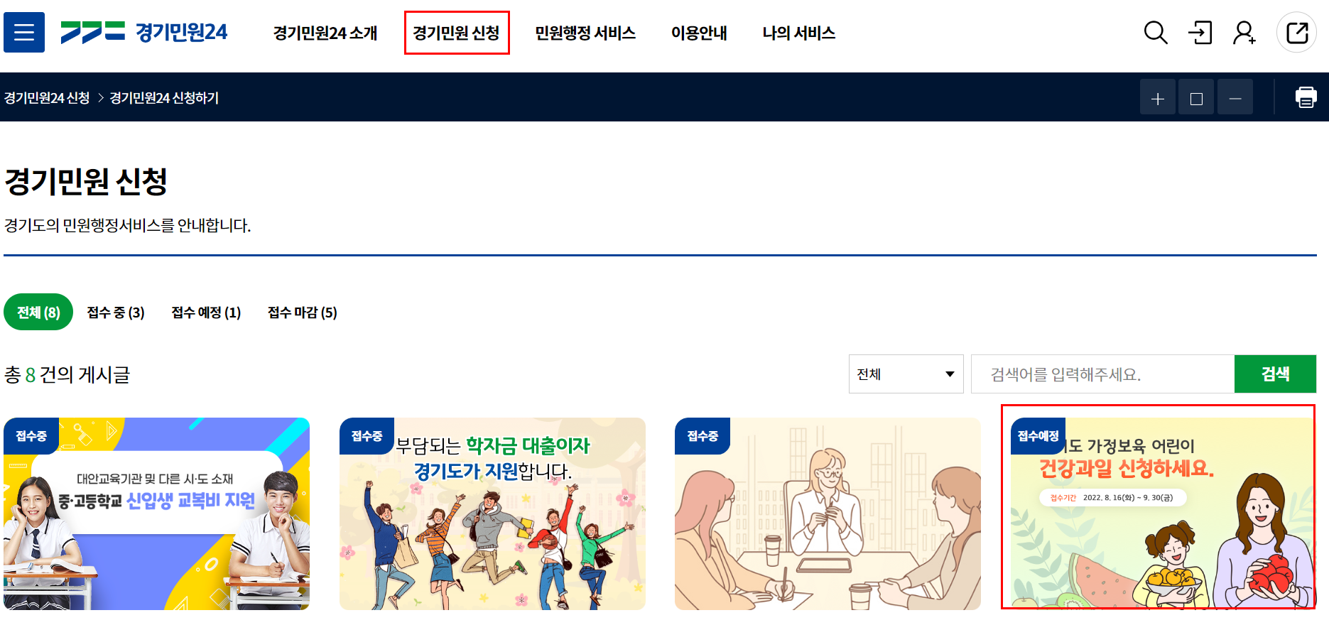 경기민원24 홈페이지에 접속하셔서 상단에 있는 메뉴 경기민원 신청을 클릭하면 오른쪽 부분에서 위 사진 빨간색으로 체크한것과 같이 경기도 가정보육 어린이 건강과일 지원사업 신청 카테고리를 확인할 수 있습니다.