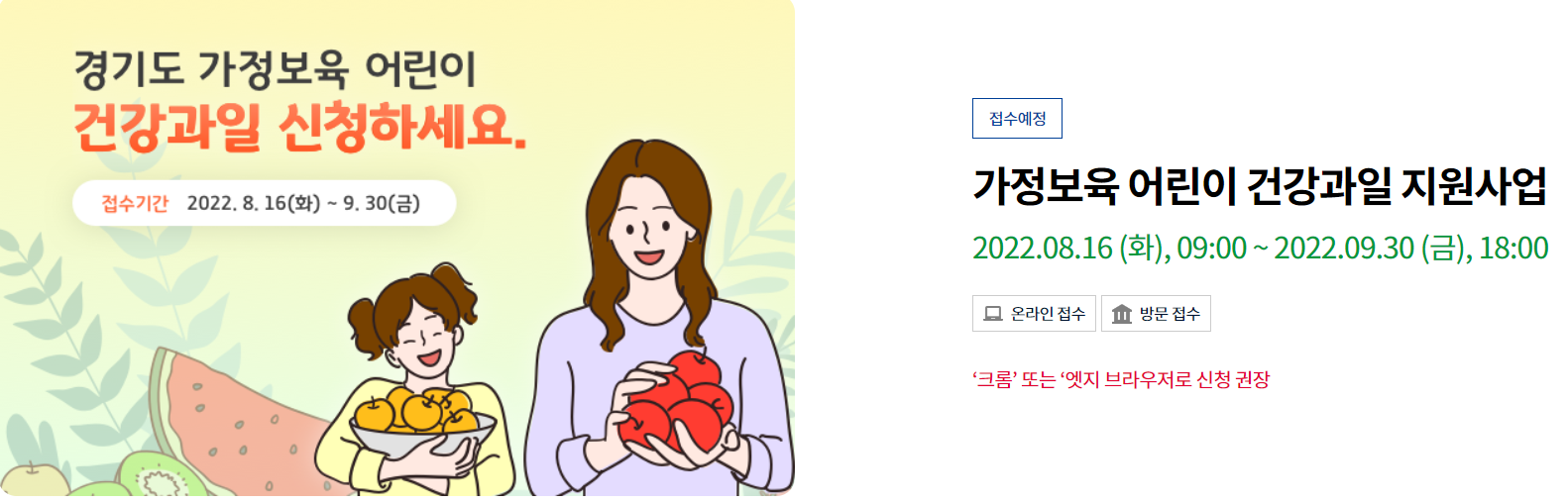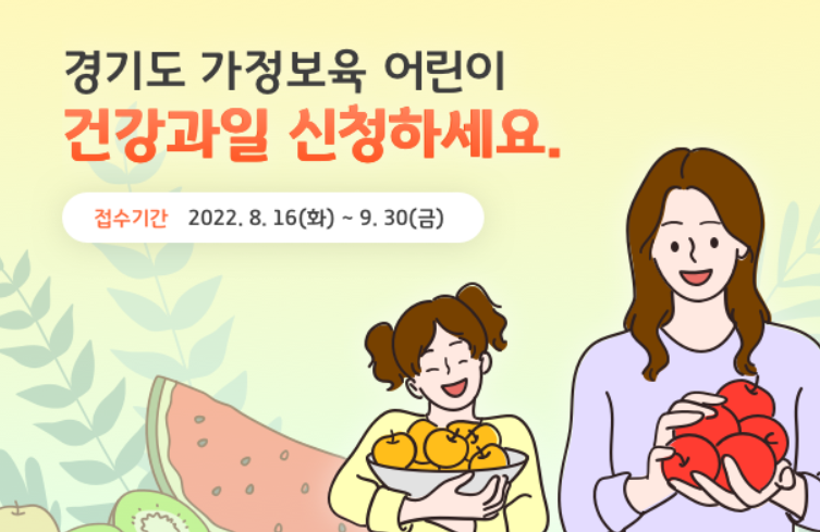 경기도 수원시는 유치원이나 어린이집에 보내지 않고 가정에서 보육하는 어린이들에게 신선한 제철과일을 제공하는 사업 '2022년 경기도 가정보육 어린이 건강과일 지원사업' 대상자를 모집한다고 밝혔습니다. 해당 사업의 지원대상, 지원내용, 지원절차, 신청방법등에 대해서 알아보도록 하겠습니다.
