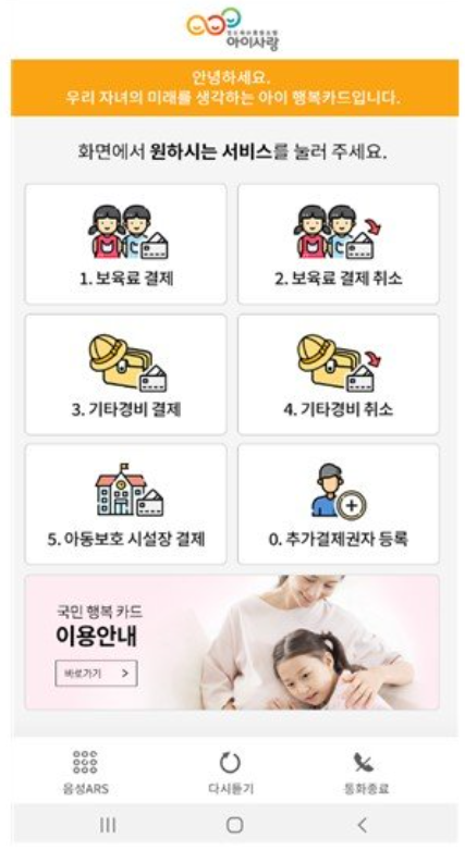 - 자녀의 보육료 결제 시 스마트폰 화면을 보면서 결제할 수 있도록 개선, 청각장애인등 음성 자동응답(ARS) 사용이 원활하지 못했던 사용자 역시 이전보다 쉽고 편리하게 결제 서비스 이용 가능