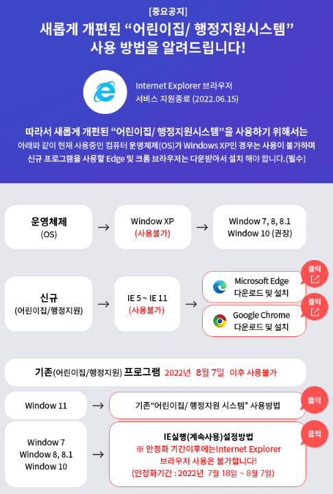 개편된 보육통합정보시스템을 사용하기 위해서는 기존의 인터넷 익스프로러 브라우저로는 사용이 불가합니다. 아래의 정리된 개편된 보육통합정보시스템 사용 방법을 확인하시기 바랍니다.