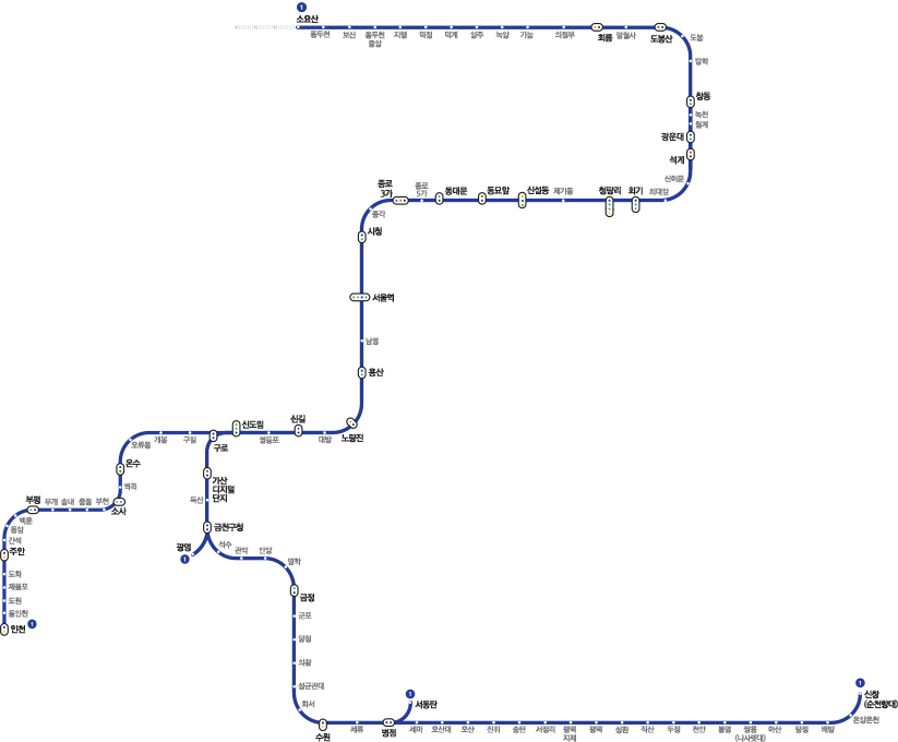 대한민국 지하철 이용객수가 많은 노선도중 하나인 서울 지하철 1호선의 이미지입니다. 또한 대한민국 최초의 지하철이기도 합니다. 1호선은 인천과 수원, 천안까지 연결되어 있으며 경부선, 호남선, 경의선, 경원선, 중앙선, 경춘선, 경인선등 처음 개통된 지하철 노선답게 굉장히 많은곳과 연결되어 있습니다.