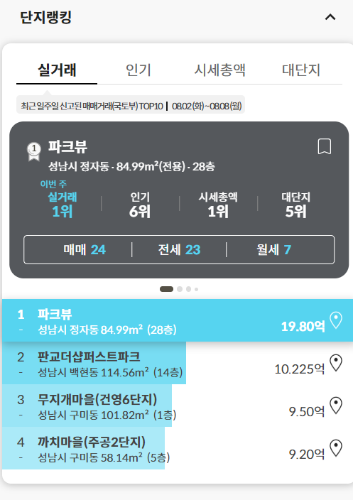 관심있는 지역을 클릭하면 해당지역의 평균시세와 전세가율, 거래량을 확인할 수 있습니다. 더불어서 해당지역에서 거래가 많이 되는 아파트를 순위별로 확인할 수 있으며 해당 아파트 거래가능한 물량 역시 눈에 잘 들어오게 정리되어 있습니다. 예를들면 KB부동산을 들어가서 위 사진과 같이 분당쪽에 관심이 있다면 분당구를 클릭하시면 앞서 언급한 자료들을 확인할 수 있습니다.