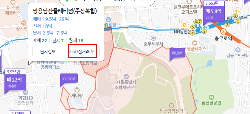 위 사진에서 처럼 지도에 뜬 매물에 마우스를 갖다대면 매매가격과 전세가격, 월세가격을 확인할 수 있으며 시세 및 실거래가를 자세하게 확인하시려면 시세/실거래가를 클릭하시면 됩니다.