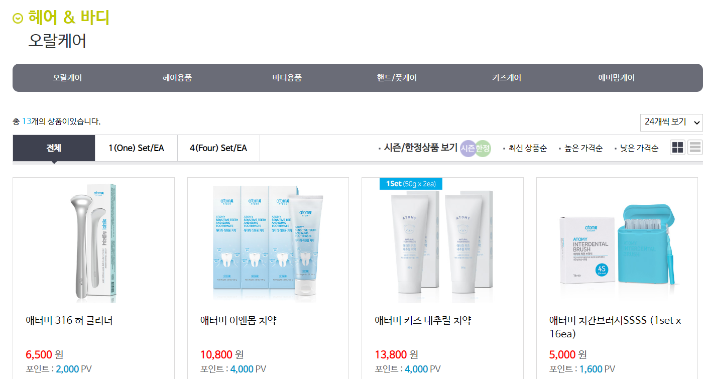 오랄케어쪽을 클릭하여 들어가면 애터미에서 판매하고 대표적인 상품인 치약과 치솔류를 확인 할 수 있습니다. 퀄리티가 좋아서 집에 한번쓰기 시작하면 꾸준히 사용하게 되는것으로 유명한 애터미사의 오랄케어 제품입니다.