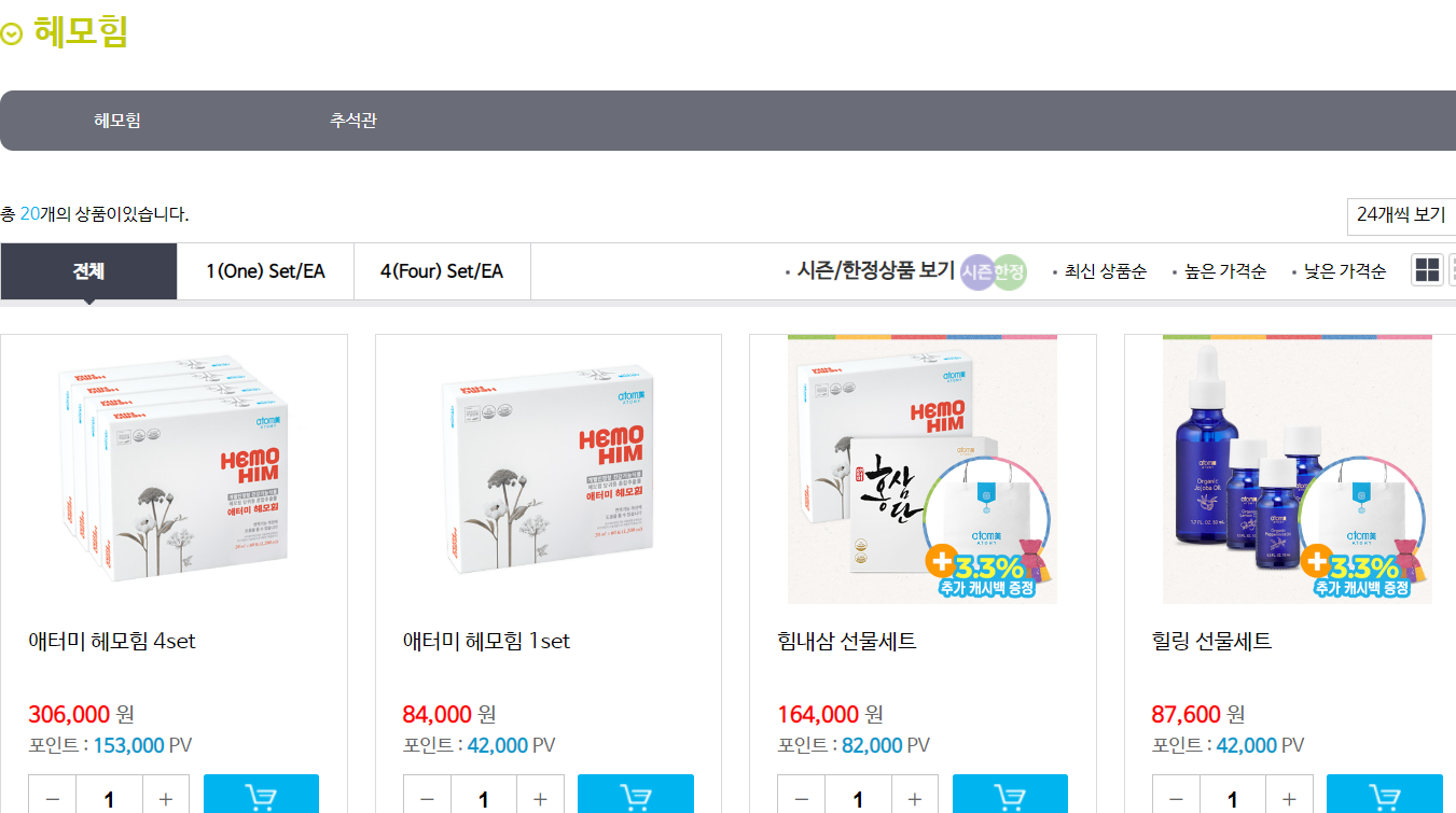 애터미 대표적인 상품중에 자체브랜드인 헤모힘 제품을 꼽을 수 있습니다. 헤모힘은 면역에 좋은 건강기능식품이며 누적매출액이 2조를 돌파했을만큼 꾸준하게 소비자들이 찾는 제품이라고 합니다.