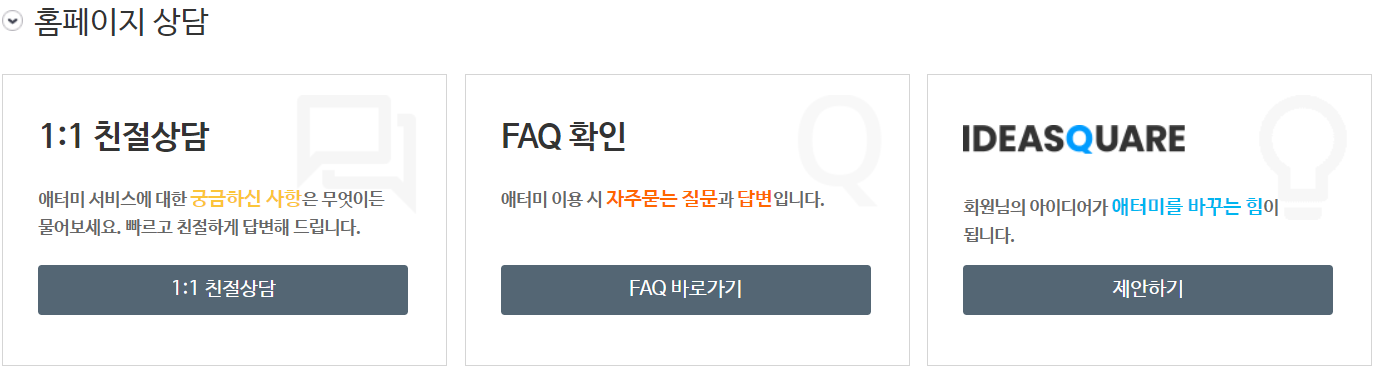 홈페이지 상담은 1:1 친절상담 / FAQ 확인 / IDEASQUARE 로 문의가 가능합니다.