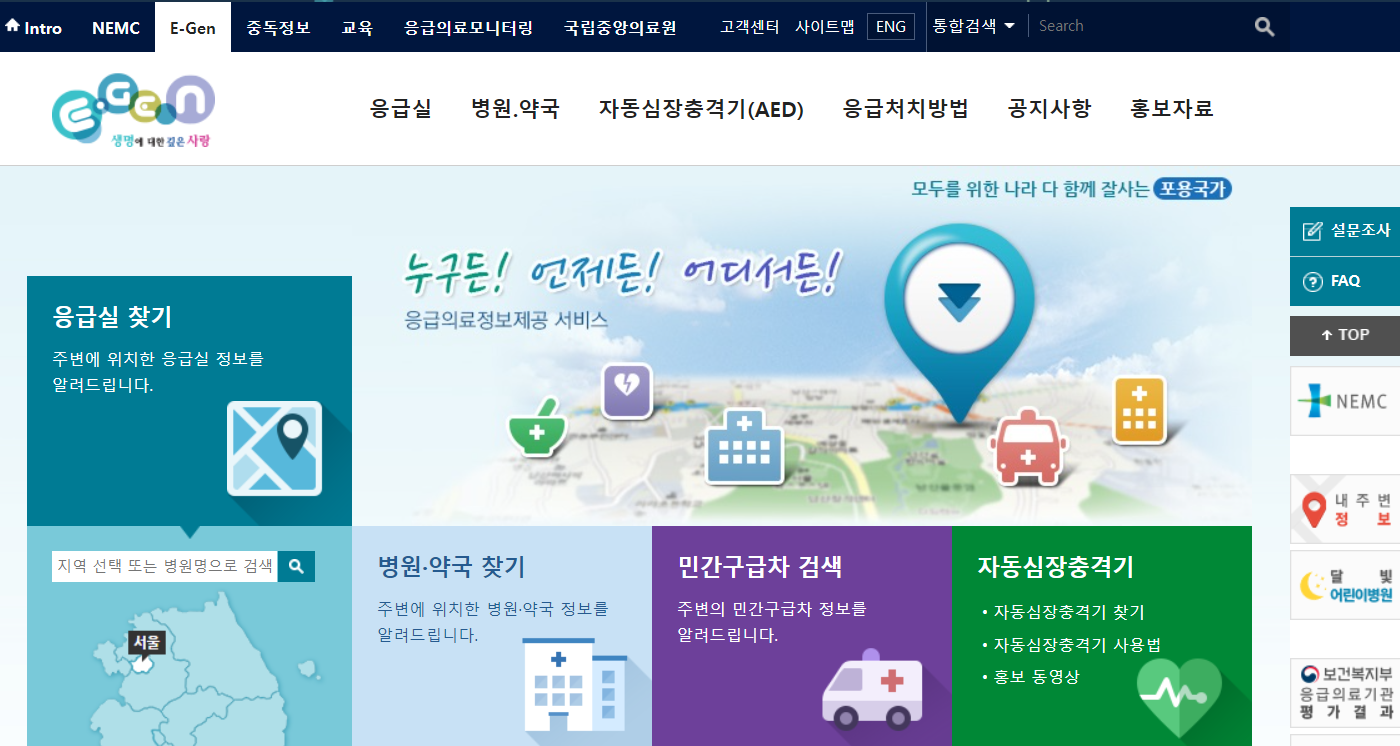 코로나 관련 응급관련 상황이 생긴다면 중앙응급의료센터에서 운영하고 있는 E-GEN이라는 홈페이지를 통해서 가까운 지역 응급의료센터를 확인할 수 있습니다.