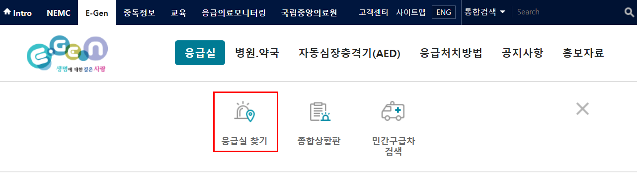 E-GEN 홈페이지를 들어가서 상단에 있는 응급실 카테고리를 클릭한 후 응급실 찾기를 눌러줍니다.