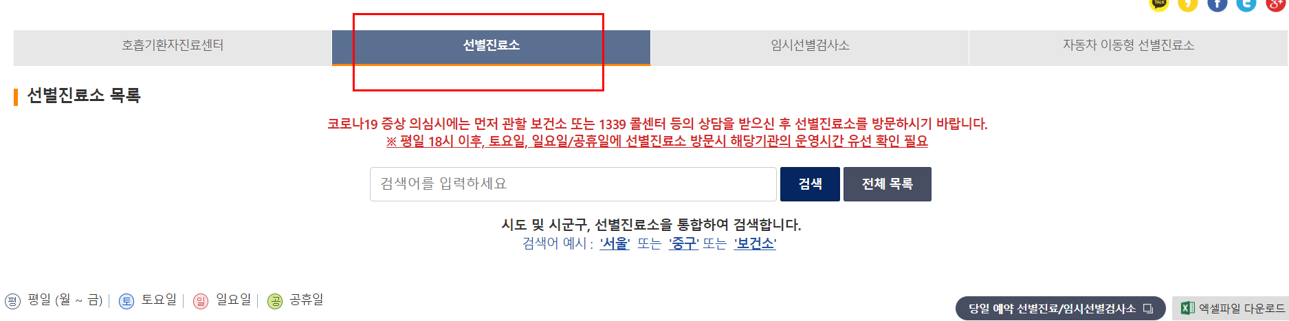 추석 연휴에도 전국 어디에서나 편리하고 쉽게 코로나 진단검사를 받을 수 있도록 선별진료소 603곳과 임시선별검사소 70곳을 운영합니다. 보건복지부에서 운영하고 있는 코로나 19 선별진료소 홈페이지를 들어가서 선별진료소를 클릭한 후 검색하고 싶은 시도 및 시군구, 선별진료소를 통합하여 검색할 수 있습니다.